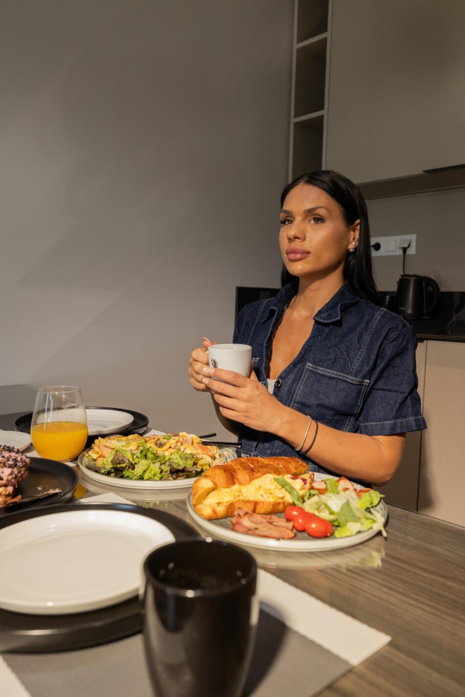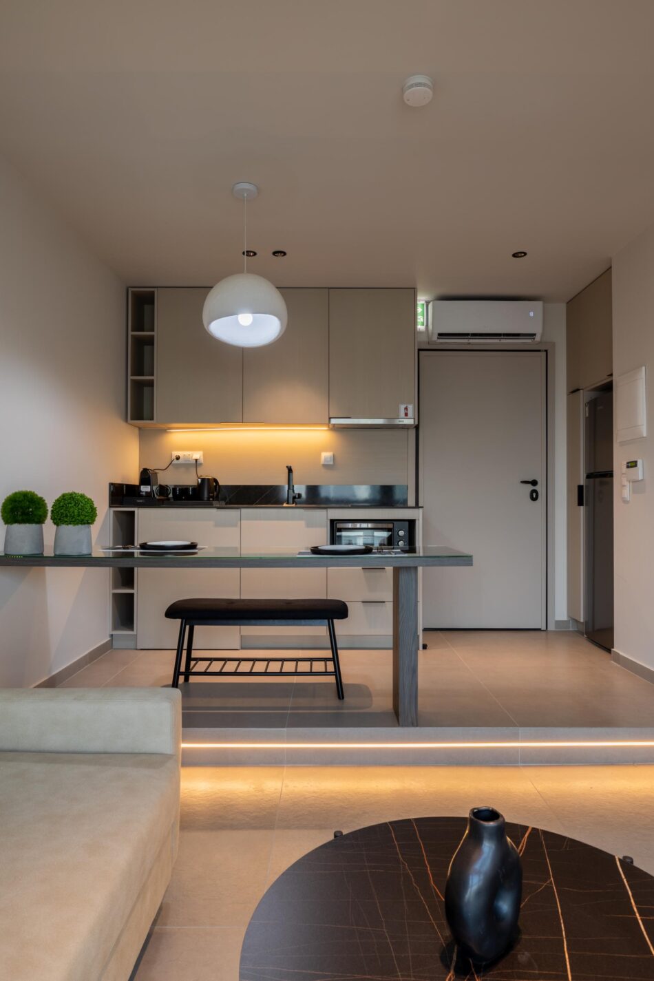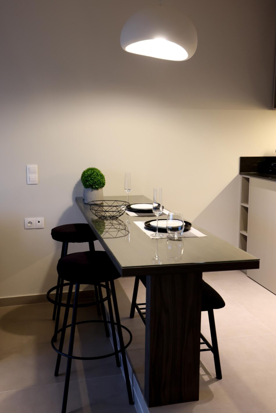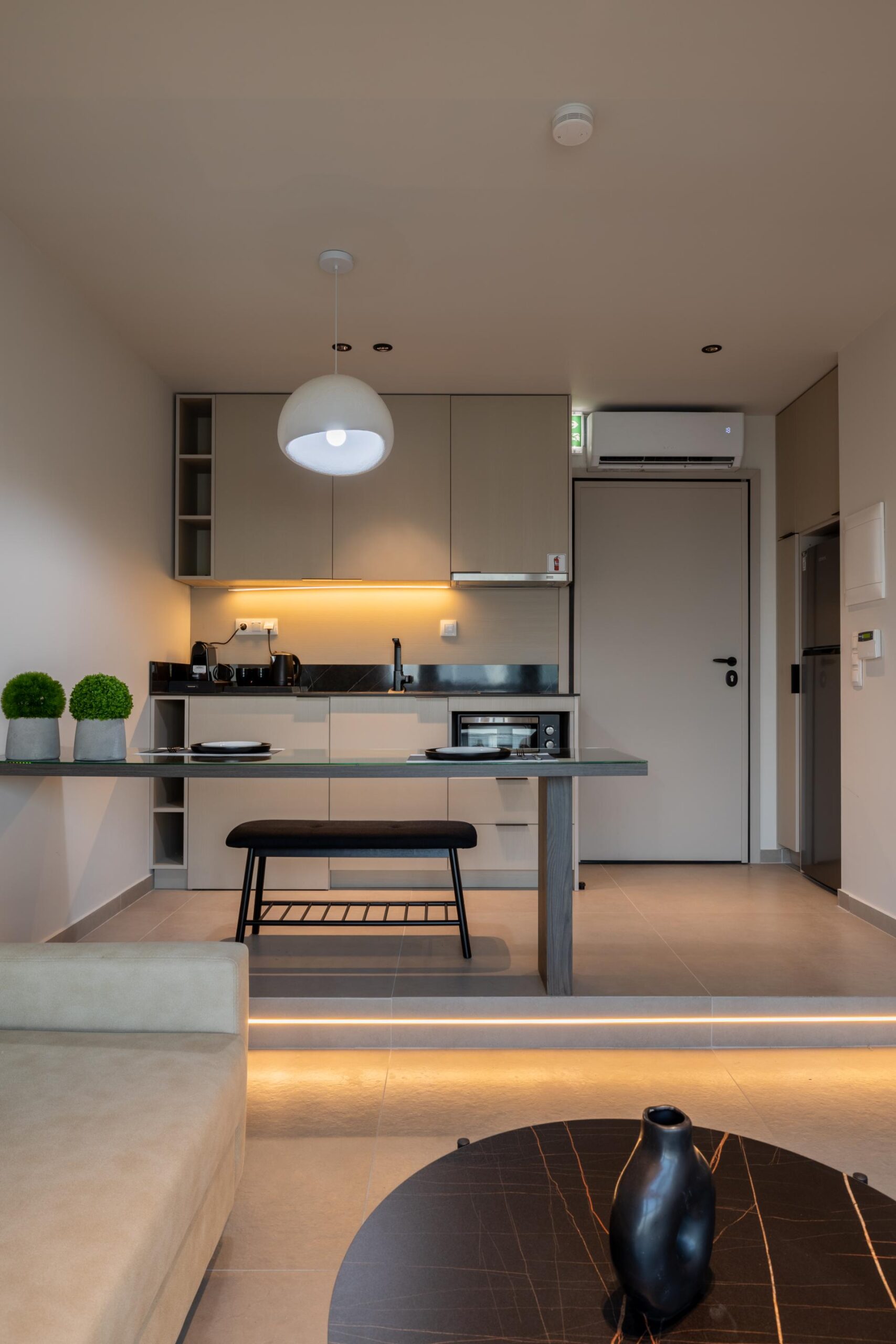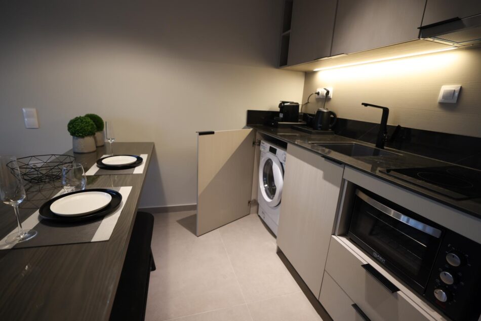 Η πλήρως εξοπλισμένη κουζίνα (εστίες, φούρνος, ψυγείο και σκεύη) σας επιτρέπει να δημιουργήσετε τα δικά σας γεύματα, ενώ οι σύγχρονες παροχές —όπως το πλυντήριο ρούχων, η smart τηλεόραση και οι ηχομονωμένοι τοίχοι— εγγυώνται μια διαμονή χωρίς περιορισμούς. Απολαύστε τον πρωινό σας καφέ ή το τσάι σας ατενίζοντας τη θάλασσα σε ένα περιβάλλον ηρεμίας.